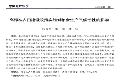 彭长生教授、2023级统计学研究生刘阳和中国农科院农经所钟钰研究员,在国内农村经济研究领域顶尖期刊《中国农村经济》2025年第11期发表学术论文《高标准农田建设政策实施对粮食生产气候韧性的影响》,这是彭长生教授第二次在该期刊发表论文,也是2018年明升明升体育