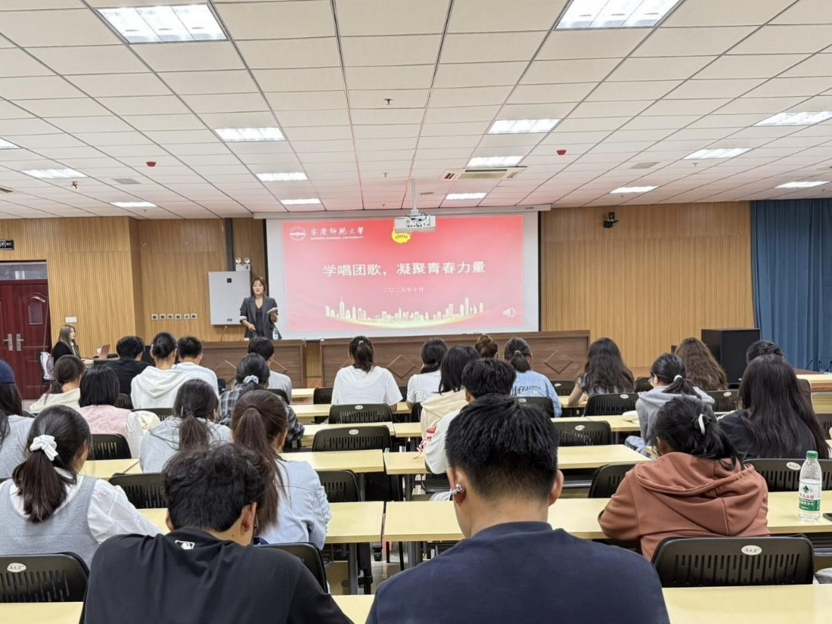 活动中,24级电子商务专业郝雨萍同学向在场团员们阐述了团歌《光荣啊,中国青年团》的创作背景与时代意义,强调团歌不仅是一段旋律,更是共青团组织精神的浓缩,是一代代青年接力奋斗的号角。随后,她播放团歌原版音频,引导团员们熟悉旋律与节奏,再逐句拆解歌词,讲解演唱时的情感表达与音调起伏,帮助团员们在理解中记忆、在感悟中传唱。