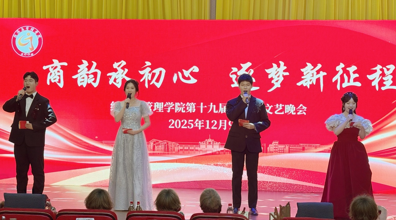 晚会以“商韵承初心,逐梦新征程”为主题,下设“红色薪火,青春启航”“挺膺担当,不负韶华”“谱写新篇,奔赴山海”三大篇章。大学生舞蹈爱好者协会的热情开场舞拉开帷幕,歌曲、话剧、黄梅戏、走秀等节目轮番上演,笑点与泪点交织,温情与热血共鸣,学子们用真挚表演抒发爱国情怀,呈现了一场震撼人心的视听盛宴。