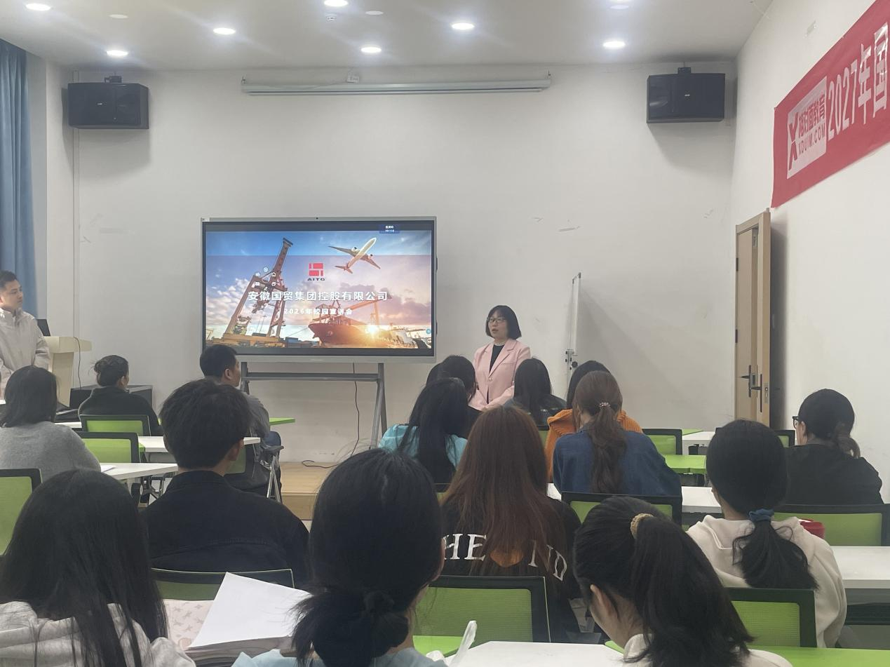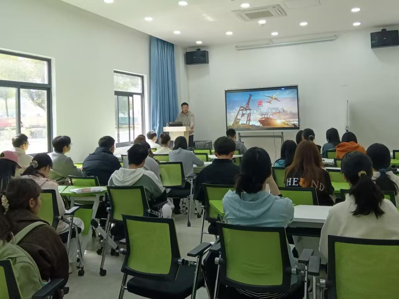 专业特色,客观剖析了本届毕业生面临的就业机遇与行业挑战。她强调,就业是最大的民生,更是高校立德树人成效的重要体现,希望同学们主动转变就业观念,摒弃“等靠要”思想,以积极务实的心态应对职场竞争。张翔围绕安徽国贸集团发展历程、核心业务布局、明升体育、人才培养体系等内容展开详细讲解,结合行业实际案例,为同学们分析外贸领域的就业前景、岗位要求与发展机遇,帮助大家明晰职业方向、找准自身定位。