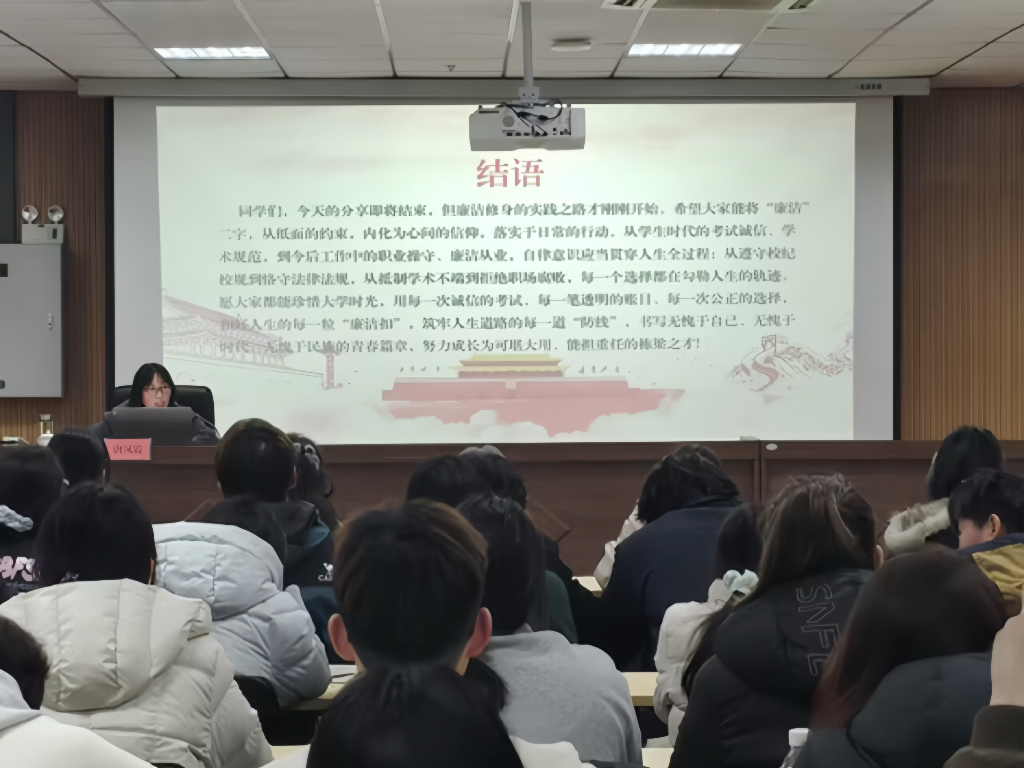 唐凤霞围绕“为何廉洁教育是大学的必修课、校园生活中的廉洁风险与底线、迈向廉洁人生的大学四年规划以及廉洁自律从我做起”四个核心方面,结合高校领域典型案例、校园廉洁风险点,用通俗易懂的语言、生动鲜活的事例,深入剖析了廉洁修身对青年成长的重要意义,细致解读了校园生活中评优评先、奖助学金评定、学生干部履职等场景下的廉洁底线要求,引导同学们认清廉洁风险、坚守廉洁初心。